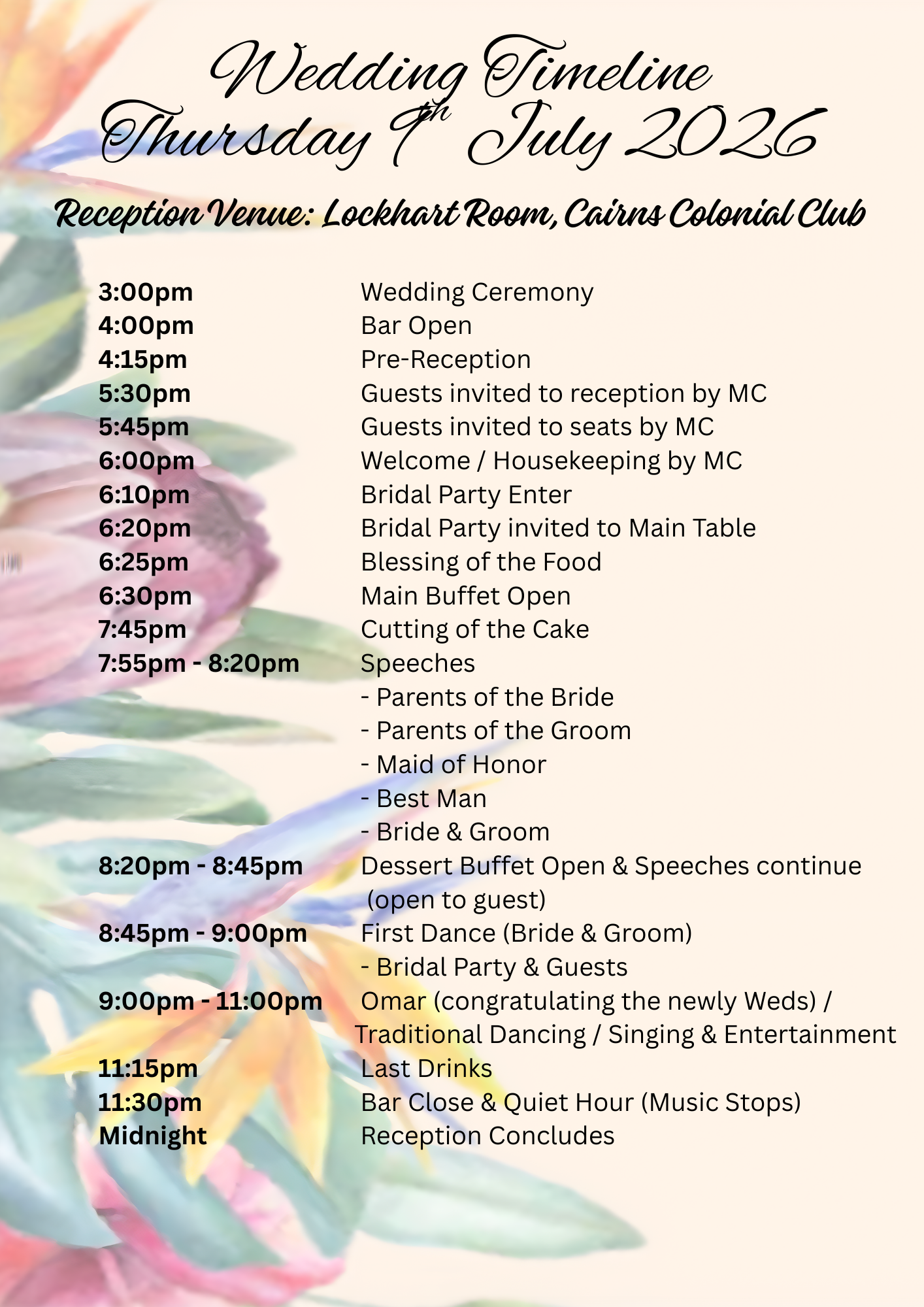 Wedding reception is for invited guest only. Plus-ones & guest are most welcome to attend the wedding ceremony and attend the tevu tevu (Fiji gift ceremony) which will be held on Friday 10th July, 2026 at Serbian Cultural Centre Cairns, 73/79 Greenslope Street, Edgehill QLD from 10:30am onwards, Lunch will be provided.